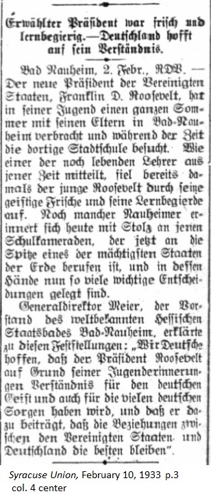 February 10, 1933 page 3 — Germany hopes for his Understanding _____ General Director Meier, the chairman of the world famous Hessian State Bath in Bad Nauheim said regarding this statement, "We Germans hope that, in light of his early childhood memories, President Roosevelt will have an appreciation for the German intellect and for our many German concerns and that he sees to it that the relationship between the United States and Germany remains on the best of terms. |