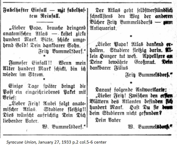 January 27, 1933 page 2 _____ "Dear Papa, I urgently need a anatomical atlas. It costs around 100 Marks. Please send money promptly! Your grateful son, Fritz Bummelsdorf." Excellent idea! If the old man sends one hundred Marks, I'll have electricity again. A few days later the mailman delivers a package with a letter:
