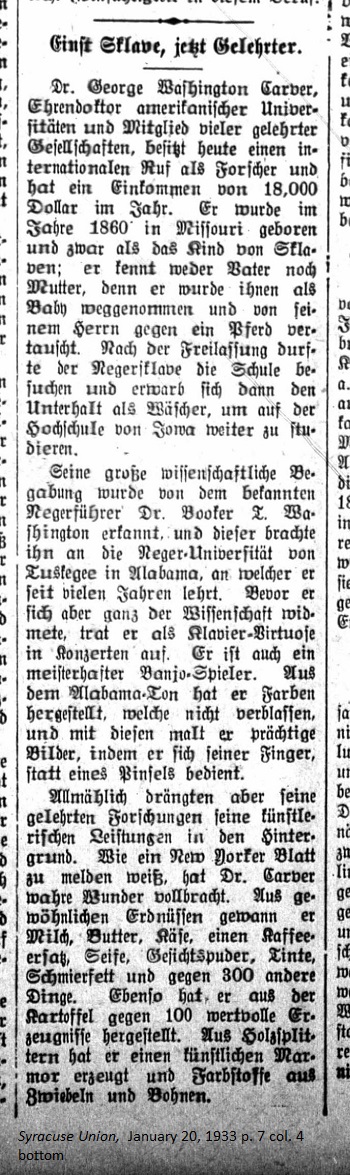 January 20, 1933 page 8 _____ Dr. George Washington Carver, honorary doctor of American universities and member of many scholarly societies, today possesses an international reputation as a researcher and has an income of 18,000 Dollars per year. He was born in Missouri in 1860 as the child of slaves. He did not know his father or mother because he was taken away as a baby and traded by his master for a horse. After the Emancipation the Negro slave could attend school and then he earned his living as a launderer so he could further his studies at the high school in Iowa. His great scientific aptitude was recognized by the famous Negro leader, Dr. Booker T. Washington, who brought him to the Negro University of Tuskegee in Alabama, at which he taught for many years. However before he completely devoted himself to science he performed as a piano virtuoso at concerts. He was also a masterful banjo player. From Alabama clay he produced pigments which did not fade and with which he painted beautiful pictures. He used his fingers rather than paintbrushes. Over time his scholarly research forced his artistic achievements into the background. As a New York newspaper reported, Dr. Carver had performed miracles. From the ordinary peanut he produced milk, butter, cheese, a coffee substitute, soap, face powder, dye, grease and 300 other items. From potatoes he produced 100 valuable products. From wood splinters he developed an artificial marble and from onions and beans he produced dyes. |