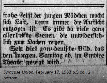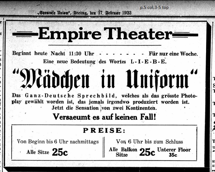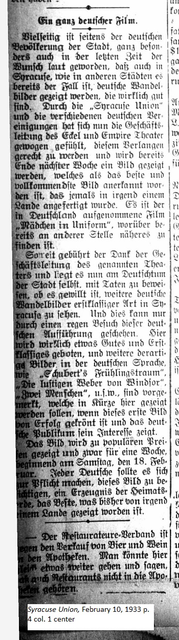 February 10, 1933 page 4 _____ From many sides on behalf of the German people of Syracuse and other cities, particularly in recent days, the desire has been expressed to view really good German movies. Through the efforts of the Syracuse Union and various German associations the management of the Eckel and Empire Theater feels compelled to do right by this desire and by the end of next week will show a film deemed the best and most perfect movie produced in any country. It is the German film "Mädchen in Uniform" (Girls in Uniform,) which is already being shown in other nearby places. We owe the management of the theater our thanks and now it is up to the German community of this city to prove whether it is willing to see other first class, German cinema in Syracuse. And this can only happen through regular attendance of these German productions. Something really good and first rate will be offered along with similar films in the German language including "Schuberts Frühlingstraum" (Schubert's Dream of Spring,) Die lustigen Weiber von Windsor (The Merry Wives of Windsor,) "Zwei Menschen" (Two Men,) etc., which will be shown in the near future if this first movie is crowned with success and demonstrates the German public's interest. The film us shown at a popoular price and only for one week beginning Saturday, February 18th. Every German should consider it a duty to see this film, a product of the homeland, the best shown thus far from any country. |