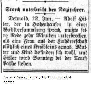 January 13, 1933 page 5 _____ Detmold, January 12. — Adolf Hitler, who spoke at an election rally in Hohenhaufen, had to discontinue his speech for ten minutes as a woman in the audience suddenly gave birth to a baby boy. Mother and child are well, and Hitler will stand as godfather on Sunday at the Baptism. |