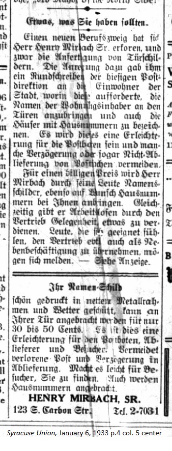January 6, 1933 page 4 _____ Mr. Henry Mirbach Sr. has chosen a new line of business making doorplates. The inspiriation came from a circular from the local post office to the residents of the city requesting that names of the residents be listed on their house doors along with the house number. This would make things easier for the postmen and avoid delays or non-delivery of mail. For a modest price Mr. Mirbach will have his people create and install nameplates for you and add house numbers if desired. At the same time, through this enterprise he is giving unemployed people the opportunity to earn some money. People who feel inclined to eventually take over this sideline may apply. — See the Ad. Your Nameplate beautifully embossed in a metal framework and weather resistant, can be installed on your door for only 30 to 50 cents. It makes it easier for postmen, delivery people, and visitors. Avoid lost mail and delays in deliveries. Make it easier for visitors to find you. House Number can also be added. 123 S. Carbon St. Tel. 2-7031 |