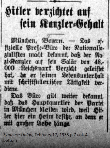 February 17, 1933 page 7 _____ Munich, Bavaria. — The official Press Bureau of the National Socialists is making it known that the Nazi Chancellor has declined his salary of 48,000 Marks since he earns his livelihood through his literary activities. The Bureau further announces that the Headquarters of the Party will remain in Munich because Hitler owns a home here, of which he is very fond. |