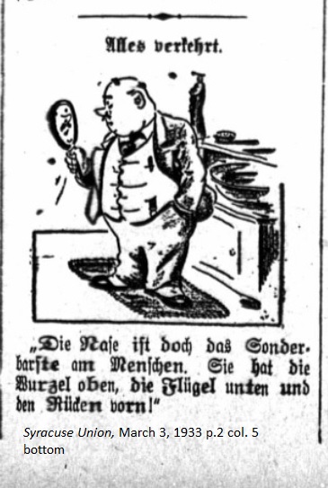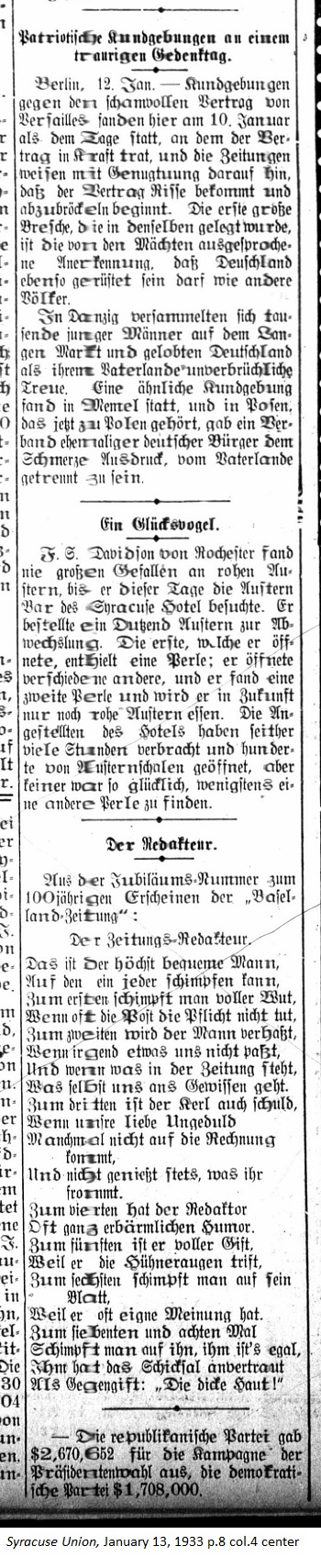 January 13, 1933 page 8 _____ Berlin, January 12. — A demonstration against the shameful Versailles Treaty took place here on January 10th, commemorating the day on which the treaty took effect. The newspapers indicated with satisfaction that the treaty was flawed and beginning to disinegrate. The first large breach came from the acknowledgement expressed by the world powers that Germany could be as well armed as the other nations. In Danzig thousands of young men assembled at the Langen Market and pledged their unswerving loyalty to Germany. A similar rally took place in Memel and in Posen, which currently belongs to Poland, a gathering of former German citizens expressed their pain at being separated from the fatherland. A Lucky Person _____ F.S. Davidson of Rochester was never very fond of raw oysters until the day he visited the Oyster Bar at the Syracuse Hotel. He ordered a dozen oysters just for a change. The first one he opened contained a pearl. He opened another one and found a second pearl. In the future he will only eat raw oysters. The employees of the hotel have spent many hours and opened hundreds of oyster shells but no one has been lucky enough to find another pearl. The Editor _____ From the Anniversary Issue of the 100 years of publication of the Baselland Zeitung: But people blame him for any event Which leads to anger, they rant and rail Whenever the paper doesn't come in the mail. Others simply hate the guy