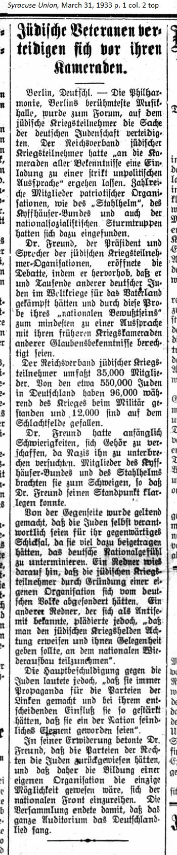 March 31, 1933 page 1 _____ Berlin, Germany. — The Philharmonia, Berlin's most famous music hall, became the forum for Jewish war participants to defend the issues of German Judaism. The Reich Association of Jewish War Participants submitted "an invitation to the comrades of all denominations for a strictly unpolitical discussion." Numerous members of patriotic organizations, such as the Steel Helmets , the Kyffhäuser Bund, and even the National Socialist Stormtroopers attended. Dr. Freund, President and speaker for the Jewish War Participants Organization, opened the debate in which he raised the issue that he and thousands of other German Jews would have fought in the World War for the fatherland and through this probe into their "national conscience" they are entitled to a discussion with their former war comrades of other faiths. The Reich Assocaition of Jewish War Participants is comprised of 35,000 members. Of the approximate 550,000 Jews in Germany 96,000 served in the military during the War and 12,000 died on the battlefield. Initially Dr. Freund had difficulty getting people's attention because the Nazis attempted to interrupt him. Members of the Kyffhäuser Bund and the Steel Helments quieted them down so that Dr. Freund could make his position clear. The opposing side stated that the Jews themselves might be responsible for their current predicament since they might have contributed much to undermine the German sense of national identity. One speaker indicated that Jewish war participants had separated themselves from the German people by establishing their own organization. Another speaker, known to be an antisemite, argued "that one should watch the Jewish war heroes and give them the opportunity to participate in the nation's rebuilding." The main accusation against the Jews was "that they always created propaganda for the left-wing parties and in using their influence had grown so strong that they had become the most hostile element in the nation." In his response Dr. Freund emphasized that the right-wing parties might have dismissed the Jews and that the building of their own organization might have been the only possible means of joining the ranks of the national front. The meeting ended as the entire auditorium sang the Germany song. |