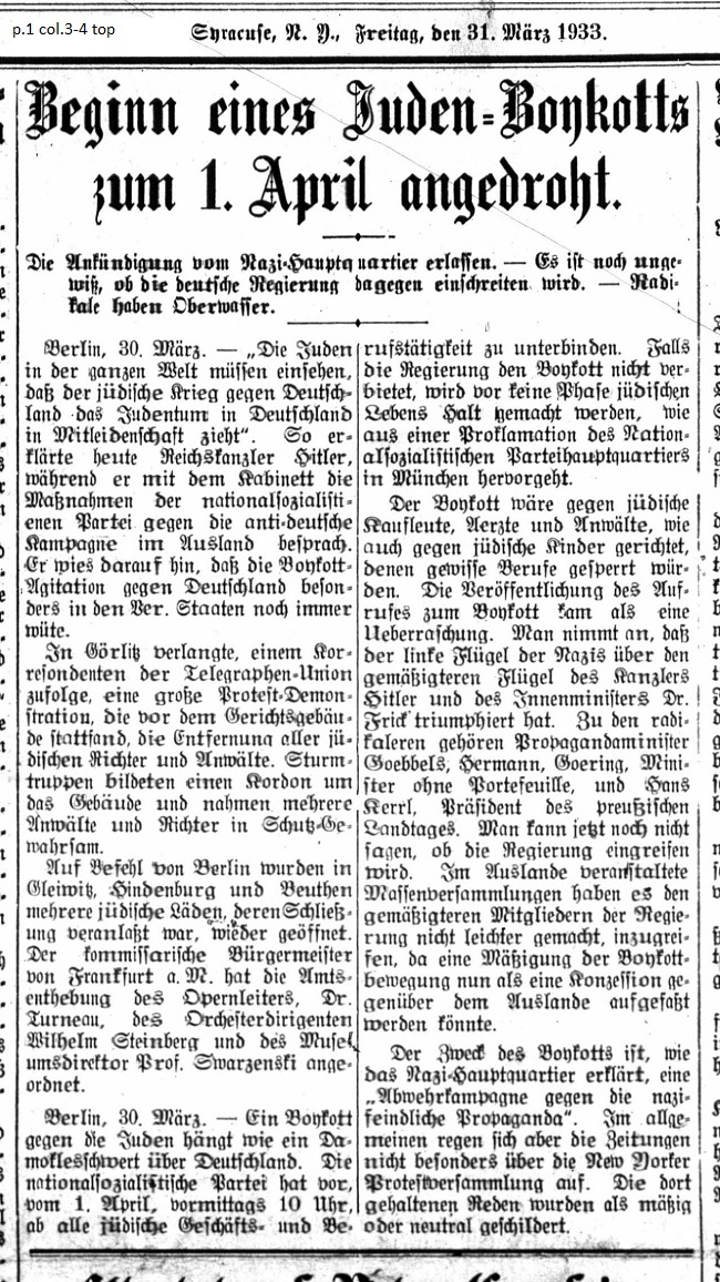 _____ The Announcement issued by Nazi Headquarters — It's uncertain if the German Government will intervene against it — Radicals have the Upper Hand _____ Berlin, March 30th. — "Jews throughout the world must realize that a Jewish war against Germany has a deterimental effect on the Jewish community in Germany." So declared Reich Chancellor Hitler today as he discussed with his cabinet the measures to be taken by the National Socialist Party against the anti-German campaign abroad. He indicated that boycott-agitation against Germany is always especially rampant in the United States. According to a correspondent of the Telegraph Union, in Görlitz a large protest demonstration was held in front of the courthouse which demanded the removal of all Jewish judges and lawyers. Storm Troopers formed a cordon around the building and took many lawyers and judges into protective custody. By orders from Berlin in Gleiwitz, Hindenburg and Beuthen many Jewish shops, which were closed, were reopened. The acting mayor of Frankfurt a. M. ordered the dismissal of the Opera Director, Dr. Turneau; the Orchestra Director, Wilhelm Steinburg; and the Museum Director, Prof. Swarzenski. Berlin, March 30th. — A boycott against the Jews hangs like a Sword of Damocles above Germany. The National Socialist Party intends to halt all Jewish businesses and workers on April 1st from 10 AM onward. In the event the government does not forbid the boycott, no halt will be made to any phase of Jewish life, according to the proclamation of the National Socialist Headquarters issued in Munich. The boycott would be directed against Jewish merchants, physicians and lawyers as well as against Jewish children, certain of whose jobs would be spared. The announcement calling for the boycott came as a surprise. One assumes that the left wing of the Nazis have triumphed over the moderate wings of Chancellor Hitler and Interior Minister Dr. Frick. Among the radical factions are Propaganda Minister Dr. Goebbels, Minister at Large Hermann Göring, and Hans Kerrl, President of the Prussian Parliament. One cannot say if the government will intervene. Mass gatherings organized abroad have not made things easiers for moderate members of the government since a tempering of the boycott can only be viewed as a concession to foreign pressure. The purpose of the boycott is, as explained by Nazi Headquarters, a "resistance campaign aimed at Nazi hostile propaganda." However in general the newspapers are not upset over the New York protest assembly. Speeches held there were described as moderate or neutral. |