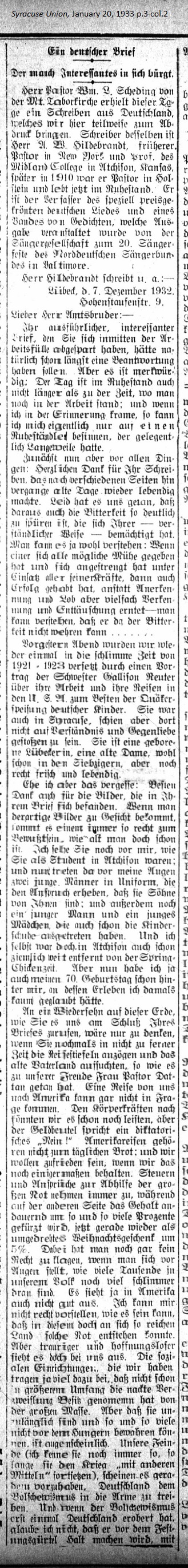 Dear Brother in Office, The detailed and interesting letter, which to took time to write while in the middle of an abundance of tasks, should have been answered a long time ago. But it's a remarkable thing, even a day in retirement is not long enough when there's still work to be done. And when I rummage through my memory I can only think of a retirement that's full of boredom. Now before anything else, sincere thanks for your letter. It's many pages made the old times live on again. It caused us sorrow that the bitterness can still be so clearly detected. Understandibly, it weighs down on you. One can well understand it. When one has made every possible effort and exerted oneself with all ones strength, then success should be gained with recognition and praise rather than misapprehension and disappointment. One can understand how one cannot defend himself against such bitterness... Two nights ago we were again placed in the dismal times of 1921 - 1923 in a lecture by Sister Gallison Reuter concerning her work and travels in the U.S.A. to benefit the Quaker Relief Program for the feeding of German children. She was also in Syracuse but didn't feel she was received with understanding and compassion. She was born in Lübeck, an old woman in her seventies but quite active and vital. But before I forget, many thanks for the photgraphs you enclosed with your letter. When one looks at the face one becomes aware of how old one is. I see you before me as you were as a student in Atchison, and now right before my eyes I see two young men in uniform who can make the claim that they are sons of yours. And there's a younger man and a young girl, who have already grow out of their childhood shoes. When I was in Atchison I was already well beyond my spring chicken days. Now even my 70th birthday is behind me and sometimes I can scarcely believe what has passed. With regard to seeing each other again on this earth, as you indicated at the end of your letter, how nice to think that in the not too distant future you might put on your travelling boots again and visit the old fatherland, as Pastor Dattan's wife has done. A journey by us to America is out of the question. Our physical strength would still allow us to do this but the wallet issues a dictatorial "No!" Trips to America are not consistent with having daily bread and we would be happy enough if we still had some of that. Taxes and calls for help in great need are ever increasing while income consistently goes down by several percentage points. Just recently we received a reverse Christmas gift costing us another of 5%. But one has no right to complain when one sees so many thousands of our people who are so much more worse off. Things in America are also not good. I can't imagine how in such a rich land so much need could exist. However here with us things are much sadder and more hopeless. The social institutions we have contributed a lot so that to a great extent total despair has not set in among the masses. However it is apparent that it is inadequate and so many cannot safeguard themselves from hunger. Our enemies (I will still regard them as such for as long as they use other means to continue the war) seem intent on driving Germany into the arms of Bolshevism. And if Bolshevism even once conquers Germany I do not believe that it will stop before the fortifications where France has doubled and tripled its eastern border. Even in France God will not allow the trees to extend into heaven*; however whether Germany would gain any advantage by it seems questionable to me. Perhaps the German people have to be driven deeper into distress before it can taste the blessing of hardship. Once again Germany seems to be isolated in the foreign politcal arena. Its internal politics are disjointed and disunified. The citizenry is divided with the radical parties on the left and right gaining ground, and eventually there will be battle between the National Socialists and the Communists. In Lübeck the Social Democrats have held the government since the revolution. The Mayor, Senate and citizenry were red. Since November, when the elections were held, there's been a turnaround; the right-wing parties have the majority, if only just. With regard to the German issues in particular, we have neither understanding nor interest. There's nothing to anticipate. Concerning American questions I stay apprised of the current issues through the Literary Digest. A female friend has sent to me this year's issues, which often arrive promptly at my house on the day of publication, although they're printed well in advance. I've determined that their reports on Germany seem to be taken their material mainly from left-wing newspapers. That's why anything one reads concerning politically motivated murderous deeds one gets the impression that the "Nazis" are usually the aggressors and are guilty of acts of violence while the reasons behind the situation are different, namely that the National Socialists (to which, by the way, I am not a member) are mostly the victims of the attack and suffer the most deaths. I've wanted to write to the Literary Digest, but there would be no point to it... As I write this letter, the Reichstag is holding its second session during which, among other things, it will deal with a representative of von Hindenburg. It's been going on for a few weeks offstage and we haven't heard anything. It's now between night and morning of the next day and I must bring my letter to a close. Meanwhile there was this scandalous scene in the stormy session of the Reichstag, which hopefully will not be repeated in the foreseeable future. The Reichstag of the pre-war era was more boring but far more dignified. There's no predicting if things will change or get better. The peace will not be disrupted until after Christmas, provided the session of the Reichstag scheduled for tomorrow really occurs. By then maybe the situation will clear up. Will the United States just once