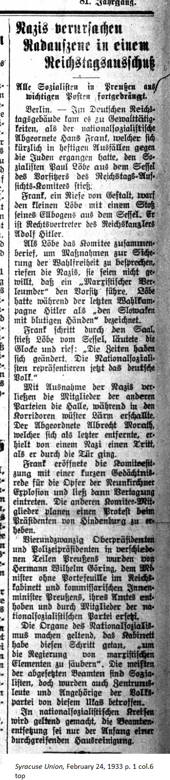 February 24, 1933 page 1 _____ All Socialists in Prussia ousted from Important Posts Berlin. — Things came to violence in the German Reichstag Building as the National Socialist delegate Hans Frank, who had recently enacted strong sanctions against the Jews, ejected Socialist Paul Löbe from the chairman's seat of the Reichstag's Supervisory Committee. Frank, a giant of a man, threw tiny Löbe off the chair with a shove of his elbow. He is the legal representative of Reichs Chancellor Adolf Hitler. As Löbe called the committee to session to discuss measures to secure electoral freedom, the Nazis shouted that they were unwilling to let a "Marxist scoundrel" lead the committee. During the last election campaign Löbe had called Hitler "the Slovak with bloody hands." Frank strode through the hall, shoved Löbe from the chair, rang the bell and shouted, "Times have changed. The National Socialists now represent the German people." With the exception of the Nazis, members left the hall while a shrill noise rang out in the corridors. Delegate Albrecht Morath, who departed last, received a kick from a Nazi as he went through the door. Frank opened the committee session with brief speech commemorating the victims of the Neunkirchen explosion, then let the session commence. The other committee members planned to lodge a protest with President von Hindenburg. Twenty-four senior presidents and police presidents from various parts of Prussia were ousted from office by Hermann Wilhelm Göring, Minister without Portolio in the Reich Cabinet and Provisional Interior Minister of Prussia. Members of the National Socialist Party replaced them. The newspaper of the Natioanl Socialists made it known that the Cabinet initiated these steps "to clean the goverment of the Marxist element." Most of the ousted delegates are Socialists but a few Central Party people and members of the Peoples Party are also affected by the edict. In National Socialist circles it's known the ousting of officials may be only the beginning of a thorough house cleaning. |