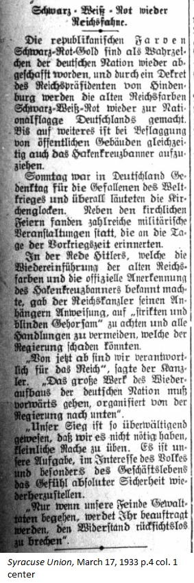 March 17, 1933 page 4 _____ The Republican colors black, red, and gold as the emblem for the German nation have again been abolished and by decree of President von Hindenburg, Germany's national flag will return to the colors black, white, and red. Additionally, and simultaneously, the swastika banner will be hoisted on public buildings. Sunday was Germany's Memorial Day for those who had fallen during the World War and church bells rang throughout the land. Along with church celebrations numerous military events took place, which commemorated the days of the pre-war era. In Hitler's speech, which announced the reinstatement of the old Reich colors and the official recognition of the Swastika banner, the Reich Chancellor admonished his followers to observe "strict and blind obedience" and avoid all actions which could damage the government. "From now on we are responsible for the nation," the Chancellor stated. "The huge work of reonstruction of the German nation must move forward, organized from the government on down." "Our victory has been so overwhelming that we do not need to exercise petty acts of vengence. It is our task to work in the interest of the people and especially to reestablish the feeling of absolute security in business. "Only if our enemies commit violent acts, will you be instructed to ruthlessly overcome resistance." |