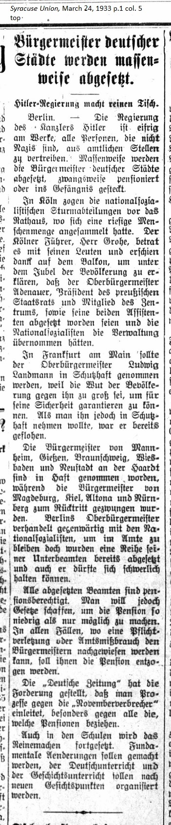 March 24, 1933 page 1 _____ Hitler Government Clears the Table In Cologne the National Socialist Division of Storm Troopers moved to the front of the City Hall where a huge crowd of people had assembled. The Cologne leader, Mr. Grohe, entered the building with his people and then appeared on the balcony in order to announce to the cheering crowd that Executive Mayor Adenauer, President of the Prussian State Council and member of the Central Party along with both of his assistants had been fired and that the Nationl Socialists had taken over the administration. In Frankfurt am Main Executive Mayor Ludwig Landmann was supposedly placed in protective custody because the rage of the people against him was so great that it was necessary to guarantee his safety. He had already fled before he could be taken into custody. The mayors of Mannheim, Giessen, Braunschweig, Wiesbaden, and Neustadt on the Haardt were taken to prison while the mayors of Magdeburg, Kiel, Altona, and Nuremburg were forced to retire. Berlin's Executive Mayor is currently dealing with the National Socialists to stay in office but many of his subordinates have already been fired and even he may find it difficult to retain his post. All the ousted officials are eligible for pensions. Laws will have to be made to make these pensions as small as possible. In all cases where dereliction of duty or abuse of office can be proven, their pensions will be taken away. The Deutsche Zeitung (German Newspaper) has demanded that trials be conducted against the "November Outlaws," especially against all those who draw pensions. Even in the schools measures to clean house have been initiated. Fundamental changes shall be made whereby German instruction and the teaching of history shall be organized in accordance with a new perspective. |
