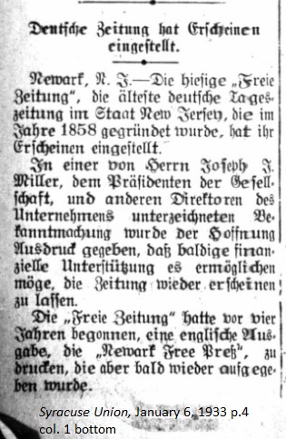 January 6, 1933 page 4 _____ Newark, N.J. — The city's Freie Zeitung, the oldest German daily newspaper in the State of New Jersey founded in 1858, has ceased publication. In an announcement signed by Mr. Joseph J. Miller, the president of the firm, and other directors of the enterprise, it was hoped that as soon as financial support is made available, the newspaper will resume publication. The Freie Zeitung began publishing an English edition four years ago titled the Newark Free Press, however it ceased publication soon after its start. |