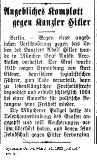 March 31, 1933 page 3 _____ Berlin. — Due to an alleged conspiracy against the life of Chancellor Adolf Hitler, Count Anton Arco-Valley was arrested in Munich. The Count was condemned to death for the 1919 murder of Kurt Eisner, Bavarian Socialist leader, then granted clemency and sentenced to life imprisonment. In 1924 he was finally set free under an amnesty for political prisoners. The Munich Police tapped the Count's telephone connection and overheard conversations by the Count regarding his hostility towards Hitler. |