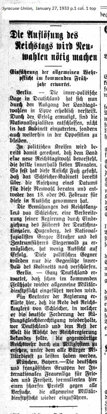 January 27, 1933 page 1 _____ Introduction of Compulsory Military Service expected in the upcoming New Year In political circles it's already being forecast that new Reichstag elections will be pending for the country, for the third time in seven months. This opinion is one such firm footing that the Schleicher Cabinet is already discussing a date for the new election on either February 18th or 26th. Efforts by Reichs Chancellor von Schleicher to secure an extention of his government through inclusion of the leaders of the German Nationals, Hugenberg; the National Socialists, Gregor Strasser; and the Central Party under Stegerwald, have little prospect of success. These political opponents would only sharpen the antagonism within the Cabinet. Berlin. — All of Germany expects that in the coming year universal military conscription will be implemented again. A representative for the government states that the speech by Reichs Chancellor von Schleicher, in which he repeated the German demand for armaments parity, shall indicate to Germany and the world the Reich goverment's intention to replace the current defense system with a military system under which all citizens will have to perform military service. Munich, Bavaria. — The German and French groups of the International Women's League for Peace and Freedom registered a strong protest against all attempts to reinstate compulsory military service. |