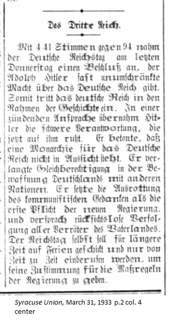 March 31, 1933 page 2 _____ With 441 votes to 94 last Thursday the German Reichstag made a decision which gives Adolph [sic] Hitler almost unconditional power over the German Reich. Thus the German Empire goes down in the annals of history. In a rousing address Hitler took over the difficult responsibility which had been rested upon him. He stressed that a monarchy is not in sight for Germany, He demanded equal rights in arming Germany with other nations. He placed the eradication of Communist ideology as the first duty of the new government and promised ruthless prosecution of all traitors to the fatherland. The Reichtag shall be sent off on holiday for a long period of time and only called back from time to time to give approval for the measures taken by the government. |