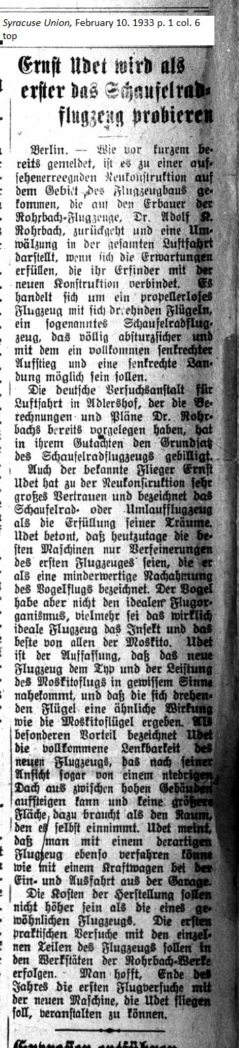 February 10, 1933 page 1 _____ Berlin. — As was recently reported, a spectacular innovation has come to the field of aircraft construction, which refers back to Dr. Adolf R. Rohrbach, designer of the Rohrbach Aircraft, and a radical change in all fields of aviation. If it fulfills its expectations, its inventor will be involved with the construction of an aircraft without propellers and equipped with rotating wings. Called a paddle wheel airplane, it cannot crash and it takes off and lands perpendicularly to the ground. The German Research Institute for Aviation in Adlershof, to which Dr. Rohrbach has already submitted his calculations and designs, has agreed to examine the fundamentals of paddle wheel aircraft. Even the famous aviator, Ernst Udet, has great confidence in the new design and indicates that paddle wheel or rotary aircraft is the fulfillment of his dreams. Udet said that to date the best machines are only refinements of the first aircraft, which he considers an inferior simulation of bird flight. Birds may not have the ideal flight organs. The truly ideal aircraft may mimic the insect, best of all the mosquito. Udet is of the opinion that new airplanes should, to a certain extent, approximate the design and method of mosquito flight and that paddle wheel wings would produce a similar effect. Udet noted the key advantage would be complete ease of handling and the ability to climb from a low roof between taller buildings and scarcely require more landing space than its own surface area. With such an aircraft one could travel as one travels in an automobile going in and out of a garage. The cost of production should not be any higher than for a traditional airplane. The first practical tests with the individual parts of the aircraft should take place in the workshops of the Rohrbach factory. It's hoped that by the end of the year the first test flights of the new machine, which Udet will conduct, can be scheduled. |