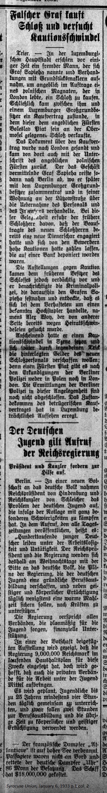 January 6, 1933 page 1 _____ Trier. — A while back a stranger appeared in the capital city of Luxembourg. He called himself Count Sapieha and he began negotiations with a estate broker to supposedly purchase a chateau for a Polish magnate living in London. Eventually the Count and a Luxembourg broker settled on a purchase agreement whereby Prince Boleslav Piat allegedly purchased an estate lying on the Upper Moselle River. The purchase agreement was sent to London and it was returned with the signature of the supposed Polish Prince. The intermediary, Count Sapieha, then traveled to Berlin, where he met with the Luxembourg estate owner in his residence on Lützowstrasse to negotiate the particulars. On this occasion the former estate owner discovered that the new owner's intermediary had engaged a new staff of servants and had paid himself out of the funds deposited in the bank by the contractual parties. The use of funds from the deposit prompted suspicion in the former owner of the chateau. He notified the criminal police, who arrested Count Sapieha and discovered that the Count was a well known con artist named Alex Woy, who was also being investigated by other authorities for marriage fraud. Apparently he had set up a scheme and later performed some sort of trick to procure the funds set aside for the new chateau staff. Upon inquiry by the Berlin Police it was discovered that there was no Prince Piat in Poland or London. Their investigation is not yet concluded. The case of the fraudulent purchase contract has created quite a sensation in Luxembourg. German Youth consider an Appeal from the Reichs Government _____ President and Chancellor issue Call for Help "Hundreds of thousands of young Germans suffer under the unemployment crisis and inactivity. Therefore on this Christmas Day the Reichs President and the government turn to the German people with the plan to provide German youth with rigorous vocational instruction along with spiritual and physical training, which should secure for them at the very least a warm meal daily to support their stamina." The government promises all associations, which have a planned approach to caring for our youth, financial support. In an attached table the message indicates that the government will set aside 9,000,000 Reichs Marks in an ongoing budget for this purpose and it is hoped that even the private sector might procure funding for youth work programs. It plans to instruct youths up to age 25 at least four hours daily with two hours dedicated to vocational training with the remaining time dedicated to physical and spiritual edification. — The French steamship "Atlantique" burned at high sea. Passengers were not on board and the German steamship "Uhr" rescued the 86 man crew. The ship cost $18,000,000. |