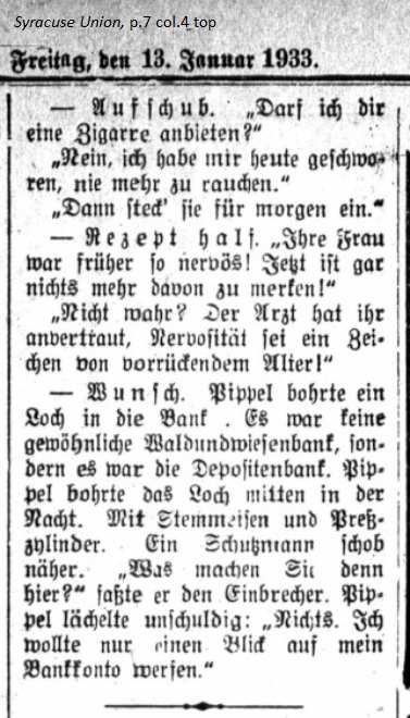 January 13, 1933 page 7 — Postponement. "May I offer you a cigar?" "No, today I swore never to smoke again." "Then keep it for tomorrow morning." _____ — A Prescription Helped. "Your wife was so nervous earlier. Now there's no sign of nervousness! "I know. The doctor told her that nervousness is a sign of advancing old age!" _____ — The Wish. A burglar bored a hole into the bank. It wasn't your usual "forest and meadow" local bank but a commercial bank and he was boring the hole in the middle of the night with a chisel and press cylinder. A policeman approached. "What are you doing here?" he asked the burglar. The burglar smiled innocently. "Nothing. I just wanted to take a look at my bank account." |