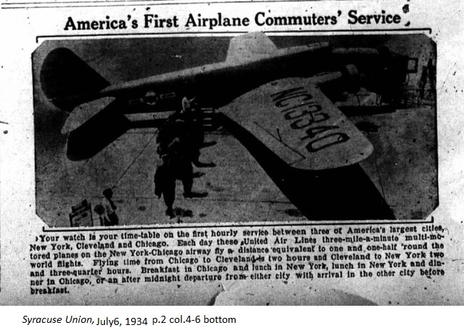 July 6, 1934 page 2 Your watch is your time-table on the first hourly service between three of America's largest cities, New York, Cleveland and Chicago. Each day these United Air Lines three-mile-a-minute multi-motored planes on the New York-Chicago airway fly a distance equivalent to one and one-half 'round the world flights. Flying time from Chicago to Cleveland is two hours and Cleveland to New York two and three-quarter hours. Breakfast in Chicago and lunch in New York and dinner in Chicago, or an after midnight departure from either city with arrival in the other city before breakfast. |