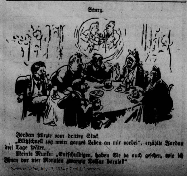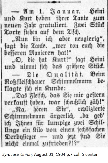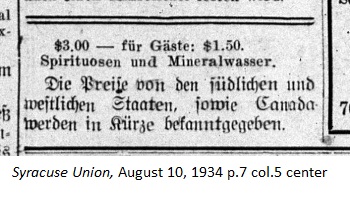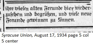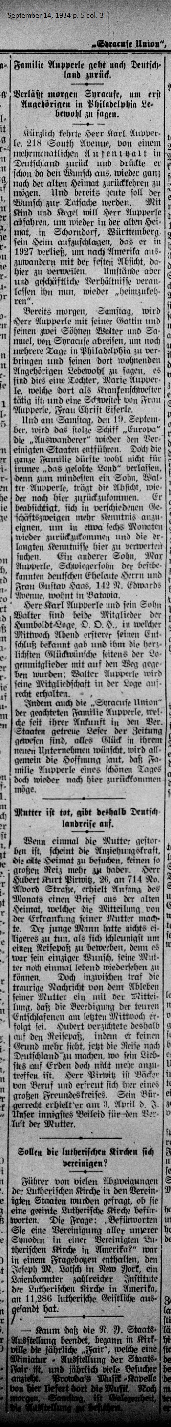 September 14, 1934 page 5 _____ Leaving Syracuse Tomorrow to first say Farewell to Relatives in Phliadelphia _____ Recently Mr. Karl Aupperle of 218 South Avenue returned from a month-long stay in Germany and expressed the wish to return to the old homeland for good. And today that wish becomes reality. Mr. Aupperle will return to the old homeland in Schorndorf, Württemberg with children and belongings and recommence residence in the home he left back in 1927 in order to emigrate to America with the firm intention of remaining here permanently. However circumstances and business relations now prompt him to once again "return home." Early tomorrow Mr. Aupperle will leave Syracuse with his wife and two sons, Walter and Samuel, to spend a few more days in Philadelphia and say farewell to relatives living there, his daughter Marie Aupperle, employed as a hospital nurse, and a sister of Mrs. Aupperle's, Mrs. Christ Eiserle. On Saturday, September 19th, the proud ship "Europe" will carry the emigrants away from the United States. But the entire family will not abandon the "Promised Land." At lease one son, Walter Aupperle, intends to come back here in around six months after he acquires more knowledge of various branches of his business then come back to apply that knowledge here. Another son, Max Aupperle, son-in-law of the well-known German couple, Mr. and Mrs. Gustav Haas of 142 N. Edwards Avenue, lives in Batavia. Mr. Karl Aupperle and his son Walter are both members of the Humboldt Lodge, Order of the German Harugari where on Wednesdy evening Mr. Aupplerle first announced his decision to leave. He received heartfelt best wishes from the Lodge membership. Walter Aupperle will retain his membership in the Lodge. The Syracuse Union also offers best wishes on their new endeavors to the respected Auuperle Family, loyal readers of the newspaper since their arrival in Syracuse. It is our hope that the Aupperle Family will return here someday. Mother is Dead; Son Cancels His Trip to Germany _____ When a mother suddenly dies it seems the appeal to visit the old homeland no longer has its charm. Mr. Hubert Kurt Pirwitz, 26 of 714 No Alvord St. received a letter at the beginning of the month from the old homeland which reported the illness of his mother. The young man had nothing more urgent to do than acquire a passport as quickly as possible in the desire to see his monther alive one last time. In the interim he got the sad news that his mother had died and the burial of the dearly departed followed last Wednesday. Hubert cancelled the passport because he no longer saw any reason to make a trip to Germany since his loved one no longer walked the earth. Mr. Pirwitz is a baker by trade and has a wide circle of friends here. He obtained his citizenship on April 3rd of this year. Our deepest sympathies for the loss of his mother. Should the Lutheran Churches Merge? _____ Leaders of the various branches of the Lutheran Church in the United States were asked this question: "Do you endorse the unifying of all our synods into one United Lutheran Church in America?" This questionaire was sent to 11,286 Lutheran clergymen by Joseph M. Lotsch of New York, a lay officer of numerous institutes in the Lutheran Churches in America. — Scarcely had the New York State Fair ended when the yearly "Fair" in Kirkville began. It is a miniature version of the State Fair which is visited yearly by many people. Prowda's Band of Syracuse delivers the music there. You have until tomorrow, Saturday, to visit the Fair. |