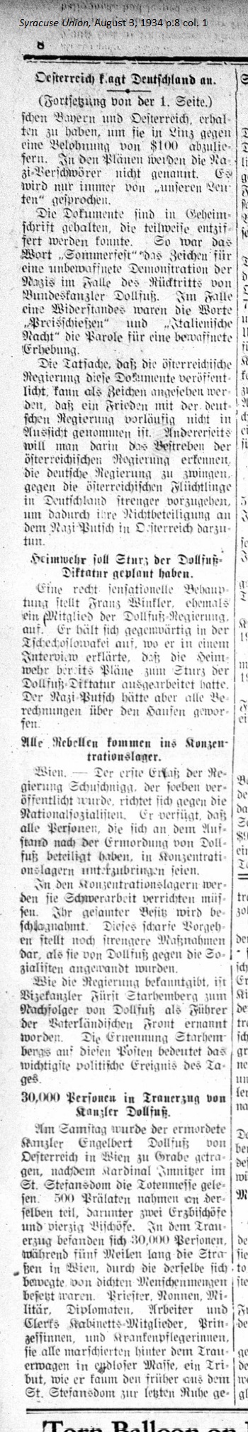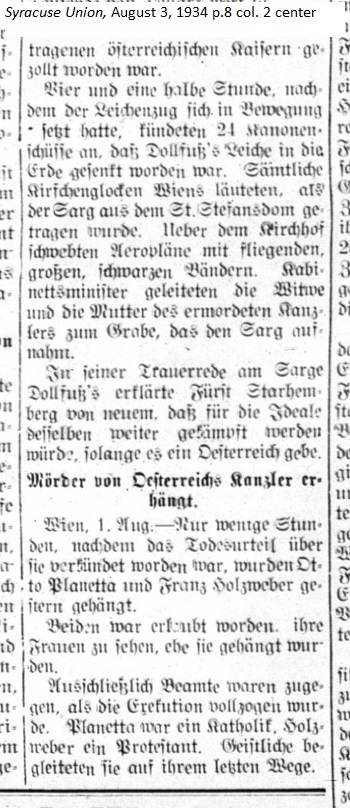 August 3, 1934 page 8 _____ (Continued from Page 1) The plans did not name the Nazi conspirators. The documents were written in a secret code, which could be partially deciphered. The word "Sommerfest" (Summer Festival) stood for an unarmed Nazi demonstration in the case of Federal Chancellor Dollfuss' resignation. In th event of a conflict the word "Preisschiessen" (Shooting Competition) and "Italienische Nacht" (Italian Night) stood for an armed uprising. The fact that the Austrian government publicized these documents can be seen as a sign that peace with the German government is not currently a prospect. On the other hand one will recognize the efforts of the Austrian government to compel the German government to take strong action against Austrian escapees in order to demonstrate its non-participation in the Nazi Putsch in Austria. Franz Winkler, previously a member of the Dollfuss government,made a truly sensational allegation. He's currently residing in Czechoslovakia, where he said in an interview that the Home Guard had worked out plans to oust Dictator Dollfuss. However the Nazi Putsch played havoc with those plans. Vienna. — The first decree of the Schuschnigg government, which was just issued, was directed against the National Socialists. It mandated that all persons who during the uprising took past in the murder of Dollfuss were to be transported to concentration camps. In the concentration camps they were sentence to hard labor. All their possessions were confiscated. This swift action placed even stricter measures than had been employed by Dollfuss against the Socialists. The government announced Vice-Chancellor Starhemberg's appointment as the successor to Dollfuss and leader of the Fatherland Front. His appointment to the post was the most important event of the day. On Saturday murdered Chancellor Engelbert Dollfuss of Austria was taken to his grave in Vienna after Cardinal Imnitzer read the funeral mass in St, Stefan's Cathedral. 500 prelates also took part in the ceremony including two archbishops and forty bishops. There were 30,000 people in the funeral procession which extended five miles down the streets of Vienna. Priests, nuns, military men, diplomats, laborers and clerks, Cabinet ministers, princesses and nurses all marched behind the funeral wagon in endless masses, a tribute rarely witnessed even for an earlier Austrian ruler being carried out of St. Stefan's Cathedral. Four and a half hours later from when the procession had been set in motion, 24 cannon shots roared as Dollfuss' corpse was lowered into the ground. All the church bells in Vienna rang as the coffin was carried out of St. Stefan's. Above the cemetery airplanes soared, waving large black banners. Cabinet ministers accompanied the widow and the mother of the murdered Chancellor to the gravesite. In his funeral address at Dollfuss' coffin. Prince Starhemberg reiterated that as long as there was an Austria the fight would go on for Dollfuss' ideals. Vienna, August 1st. — Only a few hours after the death sentence had been delivered on them, Otto Planetta and Franz Holzweber were hung yesterday. Both were allowed to see their wives before they were hung. Only officials were there when the executions were carried out. Planetta was a Catholic. Holzweber was a Protestant. Clergy accompanied them down their final path. |