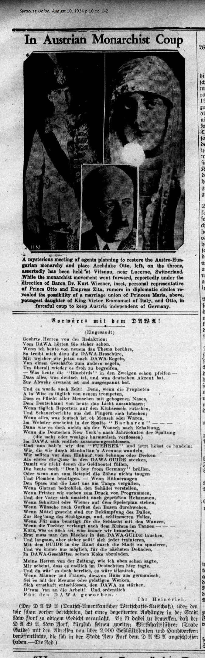 August 10, 1934 page 10 A mysterious meeting of agents planning to restore the Austro-Hungarian monarchy and place Archduke Otto, left, on the throne, assertedly has been held at Vitznau, near Lucerne, Switzerland. While the monarchist movement went forward, reportedly under the direction of Baron Dr. Kurt Wiesner, inset, personal representative of Prince Otto and Empress Zita, rumors in diplomatic circles revealed the possibility of a marriage union of Princess Maria, above, youngest daughter of King Victor Emmanuel of Italy, and Otto, in forceful coup to keep Austria independent of Germany. Onward with the DAWA! (German-American Economic Congress) _____ (Sent In) Dear Gentlemen of the Editorial Staff: You've heard a lot about the DAWA