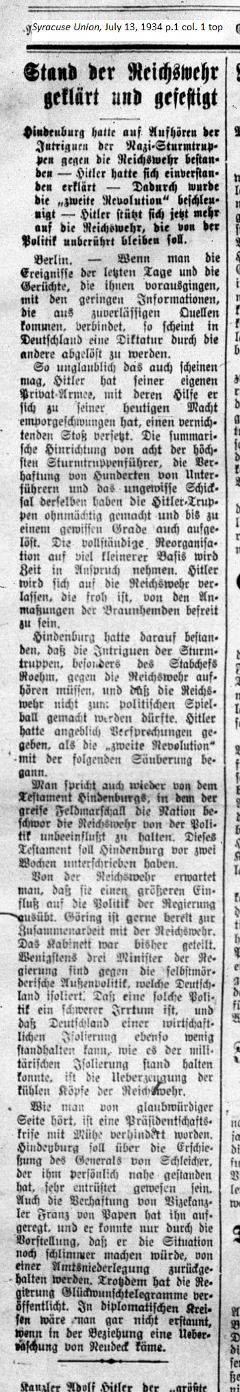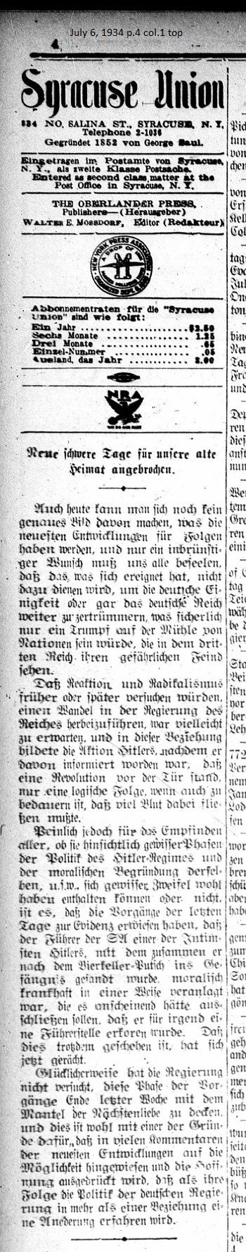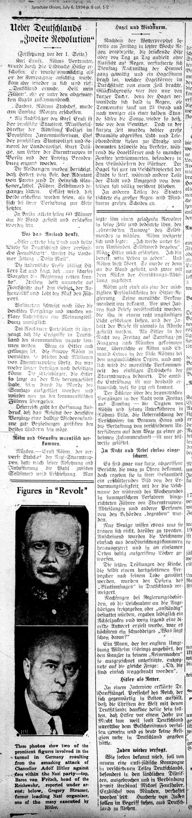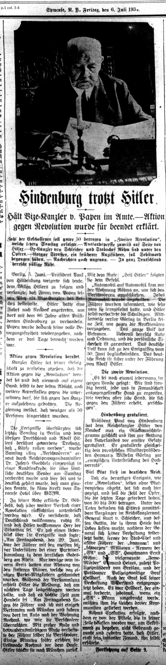 July 6, 1934 page 1 _____ Keeps Vice-Chancellor von Papen in Office — Actions against the Revolution Ended _____ Number of those shot in the "Second Revolution" last Saturday amount to under 50 individuals — For the most part the Foreign Press is on Hitler's Side — Former Chancellor von Schleicher and Staff Chief Röhm are among the Victims — Gregor Strasser, a former Nazi Leader, supposedly committed Suicide — Reports still unclear — Absolute Peace prevails throughout Germany _____ Berlin, June 5th. — Today President Paul von Hindenburg refused to grant Hitler's request and demanded that Franz von Papen retain his place as Vice-Chancellor of the nation. Hitler had taken a trip to Neudeck to negotiate there with 86-year-old President Hindenburg. As a result Papen regained unrestricted freedom of movement after having been guarded for three days. Chancellor Hitler had given his loyal retinue to understand that the action against the "Revolution" had ended and that no one by his own hand, even for the best of intentions, was to undertake further repression against those whom they considered to have revolted against the Chancellor. The government reported that fewer than 50 individuals were executed. The events occurred in Berlin and throughout Germany last Saturday. Hitler's famous threat that all conspirators "heads will roll" were reiterated by Reich Propaganda Minster Dr. Jospeh Goebbels in a radio speech which was transmitted on Saturday via all German radio stations throughout Germany and we could hear it so clearly here that one might believe that is came directly from the Syracuse Hotel via WSYR. In his speech Dr. Goebbels stated that any further attempt at revolution would be ruthlessly suppressed. He assured that Germany is completely peaceful and that Hitler was the complete master of the situation. He gave an overview of the events and said, "On Friday evening, June 29th, the Führer and his subordinates were at a Party meeting in beautiful Godesberg on the Rhine. Only a few of his inner circle had any inkling of the sinister plans, which had been hatched by certain Party members. During the meeting Hitler made an announcement that by the next day matters should be settled and it was high time this should be dealt with. On Friday evening the Führer and I flew to Munich and drove from there to Roehm's residence, where we surprised the conspirators. With great composure and wonderous courage the Führer himself arrested the conspirators. A few minutes later Roehm's bodyguards appeared before the house. Hitler sent them back to Munich. With the shout 'Heil Hitler' they obeyed his order. "Automobile after automobile arrived at Roehm's residence in order to join up with the conspirators. Each automobile was detained. The Führer was informed of how badly they had been misled. Hitler himself arrested the guilty parties. Meanwhile Goering lost no time in Berlin dealing with reactions. The populace felt reassured. Peace and order prevailed and personal security was guaranteed. The German people can congratulate itself for the events of June 30th. The German Reich is secure under the leadership of Adolf Hitler." "Once against everyone in the country can say, We are joyfully ready to take the hand of anyone who extends it to us in friendship, but we will smite the hand of anyone who raises it against the Führer." President Paul von Hindenburg sent a telegram from Neudeck congratulating Reich Chancellor Hitler for saving the fatherland from serious danger. At the same time he congratulated Prussian Minister President Hermann Wilhelm Goering for "energetic suppression of high treason." Such an event as a "revolution" seldom occurs without bloodletting as is proven here where the number of victims may range from 30 to 300. Among the dead are Hitler's immediate predecessor in the Reich Chancellor's Office, General Kurt v. Schleicher and his wife, who departed life in her own home after the General had resisted arrest. Others include Chief of Staff and active leader of the "Brown" and "Black" millions in the Armies of the SA amd SS, Captain Ernst Roehm; the often-called "Assassin" Edmund Heines, recently Police President of Breslau; and the Potdam Police Enforcer Count Helldorf. Even the Count allegedly resisted arrest. It was Helldorf who once demanded every time an "SA" man was killed, that the bodies of three Communists were to be delivered to him. Roehm's execution followed after he did not use the pistol, which was left in his cell so he could commit suicide. He had begged that Hitler, his one-time intimate friend, should shoot him. Continued on Page 8 |