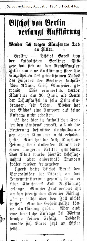 August 3, 1934 page 1 _____ Turns to Hitler because of Klausener's Death This has aroused feelings in Catholic circles of whether or not the government had made definitive charges against him. Now the Catholic diocesan newspaper has dedicated a lengthy article to Klausener's memory. The newspaper was seized but released an hour and a half later. At first Bishop Bares had sent the General Vicar of the Diocese to the Interior Minister requesting information on Klausener's death. Minister Frick referred him to Prussian Premier Göring, who said "that he himself knew nothing about the matter." Only the secret police could give information. However even a written request to Göring brought no results. Therefore Bares has not turned to Hitler himself. |