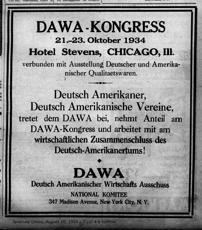 August 10, 1934 page 7 from October 21st - 23rd, 1934 in Chicago, Ill. _____ A comprehensive program has already been prepared for the Congress and it's time to answer the question, What does the German-American Economic Congress want to achieve? In this time of economic crisis it wants to offer all members of the United German Associations and other German-American organizations economic protection. It wants to guide all business people, tradesmen, artisans as well as the members of the professions such as doctors, lawyers, artists, and all the membership of the German-American organizations and other amicable large organizations as customers. [Boldface Type used by the Syracuse Union.] It wants to provide information to hundreds of thousands of its members and firms which deal in German goods and services and which reject the boycott. It wants to be an economic leader in a pocketbook format arranged by occupation and divided by district and to distribute it to members and friends. Through the German-American Economic Congress it wants of create a commuity of men and women who dedicate themselves to mutual economic support. Inquiries and information can be directed to": United German Societies, Inc., 347 Madison Avenue, New York City. [ Translator's Note: According to the April 19, 1934 issue of the Jewish Daily Review, there's an article on page 5 titled "Nazis Prepare to Strengthen Boycott Fight" which makes a direct link between the United German Societies, Inc. and the American Nazi Movement. Pages 1 and 3 also have an interesting article on the Silver Shirts of California.] The tentative program for the National Congress is as follows: Sunday, October 21st: Morning: Arrival of delegates from the East, West, South, and North. Delegates and guests of the Congress check into the largest hotel in the world, "The Stevens." Between 9:00 and 10:45 AM: Enrollment of delegates and guests. Afterwards welcoming reception of the various delegations. 11:15 AM: Opening of the Congress and an Exhibit of German and American Wares. 1:00 PM: Communal Lunch. 3:00 PM: Lecture - American Exports to Germany before the Boycott and Now. 4:00 PM: Lecture - American Imports from Germany. 5:00 PM: Lecture - The Leipzig Trade Fair. 7:30 PM: Communal Dinner in various rooms divided into delegations. Monday, October 22nd: 9:30 AM: Lecture in the large Congress Hall - The Boycott. 10:15 AM: Lecture - Why the DAWA (German-American Economic Congress) Movement? 11:00 AM: Lecture - DAWA Business People, Tradesmen and Artisans. 12:15 PM: The American Importer of German Merchandise in the Protection Plan of the DAWA Movement (Lecture.) 1:15 PM: Communal Lunch. 3:00 PM: Lecture - The DAWA Service. 4:00 PM: Lecture - American Manufacturing and Wholesaling in the DAWA Movement. 5:00 PM: Tourism Interchange - America to Germany and Germany to America. 6:00 PM: Lecture - Fostering Friendship between Two Great Nations. 8:00 PM: DAWA Banquet and Ball. Tuesday, October 23rd: 9:30 AM: Visit to the Chicago World Fair with Tour Guide. 12:30 PM: Departure Luncheon at the World Fair either at "Old Heidelberg" or "Schwarzwald." 3:00 PM: Conference of the National DAWA Council and the local executives. Optional dinner at the hotel. Prices for the Congress' so-called "all inclusive Congress tickets" were determined by distances of various cities from Chicago.