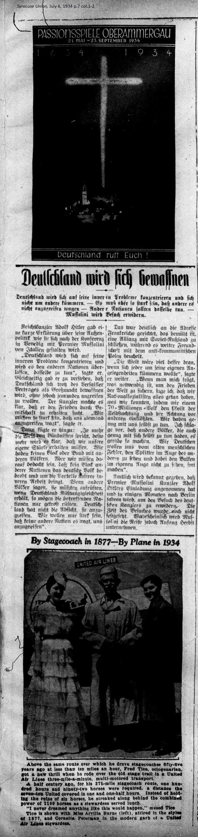 July 6, 1934 page 7 May 21st - September 23, 1934 1634 to 1934 Germany's Calling You! _____ Germany Will Rearm Itself _____ Germany will concentrate on its internal problems and not worry about others — However it must be so strong that others will not dare to attack it — Other nations have supposedly done the same — Mussolini will make a reciprocal visit _____ Reich Chancellor Adolf Hitler gave a brief explanation of his foreign politics as they will be presented at a conference in Venice with Mussolini of Italy. "Germany will concentrate on its internal problems and allow other nations to do the same," he stated. At the same time he gave to understand that despite the Versailles Treaty Germany will rearm itself as a great nation which no one else will want to attack. The Chancellor made it clear that he is seeking to maintain the peace through preparedness, "We must be so strong that no one dares to attack us." Then he added, "The more the world speaks of alliances, the more it becomes clear that we must gain our own strength. We have no block or alliance with other people. But we must be mindful that no block by other nations shall threaten the German people as we gain advantages by our internal work. When other people say they must upgrade their weapons if Germany gains weapon parity, then rest assured these other nations will build up their weaponry. Germany does not intend to attack them. We just want to be strong so no other nation will dare to attack us." It was clear that the speech was directed at France, which was attempting to seal an alliance with Soviet Russia while it pretended to have further friendship with anti-communist Poland. "The world would be better off if everyone would attend to their own affairs," he continued. "If you ask me what's necessary to secure world peace, I would say that we National Socialists have done everything we can to instill the spirit of self-respect in 70 million people and gain the respect of others. We have enough to do among ourselves. I suggest that other people who have enough to do within their own population, to just go do it. We Germans want to set ourselves free of the old human mistakes, no longer see ourselves as the splinter in the eyes of others and thus liberate ourselves from our own perceived barriers." It was offically acknowledged that Premier Mussollini had accepted Chancellor Hitler's invitation and come to Berlin in the next few months to reciprocate the visit by the German Chancellor. The time of the visit was not firmly established. Perhaps Mussolini will undertake the visit at the beginning of autumn. By Stagecoach in 1877 — By Plane in 1934 _____ A half cenury ago, for his 275 mile stagecoach route, one hundred hours and ninety-two horses were required, a distance the seven-ton United covered in one and one-half hours. Instead of holding the reins of six horses, he streaked along behind the combined power of 1100 horses as a stewardess served lunch, "I never dreamed anything like this would happen," mused Tice. Tice is shown with Miss Arvilla Burns (left), attired in the styles of 1877, and Cornelia Peterman in the modern garb of a United Air Lines stewardess. |