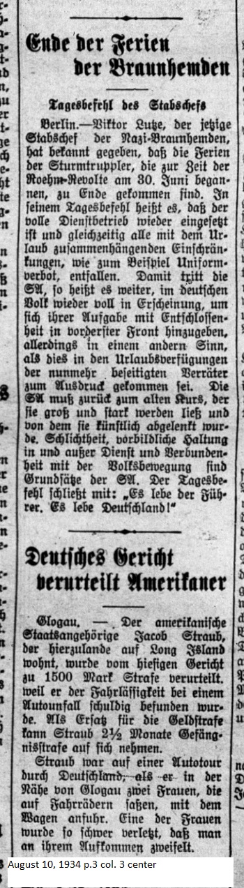 August 10, 1934 page 3 Order of the Day from the Chief of Staff Berlin. — Viktor Lutze, current Chief of Staff of the Nazi Brown Shirts, has given notice that the vacation of Stormtroopers, which began at the time of the Roehm Revolt of June 30th, has come to an end. In his order of the day it's stated that the full service operations are restored and at the same time all conditions put into effect for the vacation, such as the uniform ban, have been cancelled. The SA, as it is being called from now on, will once again be present among the German people so they may exercise their assignments with resolution on the front lines in a different sense from what was decreed in the vacation orders by traitors, who have been removed. The SA must revert to its old course which allowed it to become great and strong and away from the distractions to simplicity, exemplary behavior while on and off duty and connectivity to the people's movement, which are the grounding principles of the SA. The order of the day closes with "Long live the Führer. Long live Germany!" German Court Fines an American _____ Glogau. — The United States citizen Jacob Straub, who lives on Long Island, was fined 1500 Marks at the local court because he was found guilty of negligence in an auto accident. In lieu of the fine Straub can serve 2 ½ months in jail. Straub was on an auto tour through Germany when near Glogau he ran two women down with his car as they sat on bicycles. One of the women was so badly injured that people doubt she'll recover. |