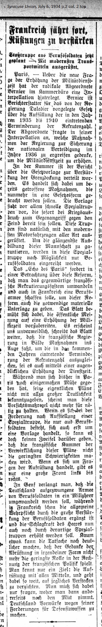July 6, 1934 page 2 _____ Combat Patrols of Career Soldiers currently planned The report on the draft of legislation for increasing border coverage was being discussed in Chamber. It dealt with previous measures which now would be cast in legislative form. The bill provides for all active special troops, which will be immediately prepared to launch a counteroffensive against the enemy should war break out. Naturally these troops will be equipped with the most modern motorized transports of every variety. In order to guarantee the best training for these squads, if possible, only career soldiers will be inserted into the ranks. Concerning this reform the Echo des Paris claimed that they should change the current French recruitment system and create a career army in France in order to give this reform the necessary material support. The newspaper was attempting to prepare public opinion for an increase in military service duration. It seems unavoidable to us, the newspaper writers further, that before long the French government will envision measures to offset reductions in recruitment by means of immediate increase in service time. While to this point in Paris they have given this some thought, they haven't made their specific plans all that clear. They seem to no longer consider it necessary to observe precautionary measures. If it comes to a demand for deployment of special troops there can be no doubt that the French Chamber will not have the slightest difficulty in implementing this plan. When it concerns the question of military buildup, there's merely a large front extending from left to right. In Geneva they demand that the army imposed on Germany should be transformed from career soldiers into a militia, while in France universal conscription is to be supplemented with a large contingent of career soldiers and the military clout is to be increased with special troops. Scarcely anything can make the case clearer that the thought of military buildup in any form no longer plays a minimal role in the reckoning of French politics. One sees only one goal: increased militarization by all means possible, going as far as relinquishing any attempt to hide the activity. One has to ask, where does the other side get the nerve to make allegations against Germany because of its demand for defense weaponry. |