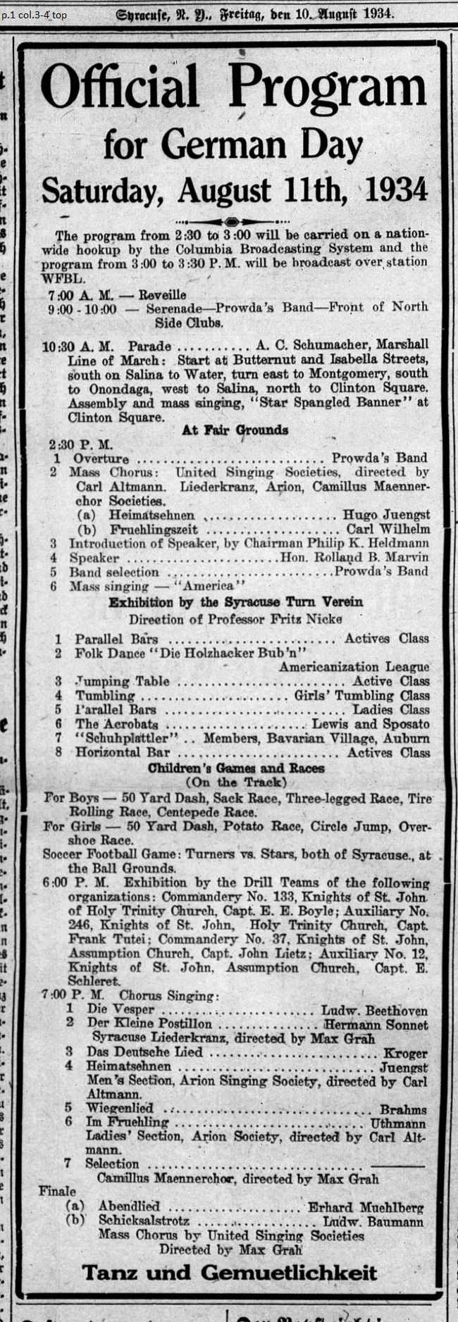 August 10, 1934 page 1 Official Program for German Day, Saturday, August 11th, 1934. |