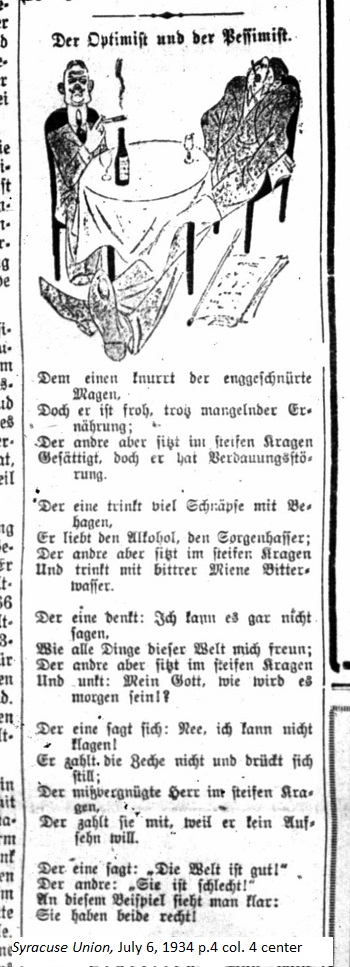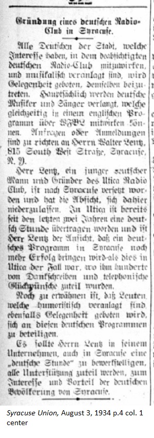 August 3, 1934 page 4 _____ All Germans in the city, who have an interest in working with a designated German radio club and are musically inclined, will be offered the opportunity to join one. Mostly German musicians and singers are wanted, who at the same time can work on an English program at WFBL. Information and applications should be directed to Mr. Walter Lentz, 815 South West St., Syracuse, N.Y. Mr. Lentz, a young German man and founder of the Utica Radio Club, has moved to Syracuse with the intention of settling here. In Utica for the last two years a German program has been broadcast and Mr. Lentz wants to have a German program here in Syracuse which will have greater success than the one in Utica, where he received hundreds of written letters in thanks and telephoned best wishes. We'd also like to mention that people who humorously inclined will also be given the opportunnity to participate in this German program. May Mr. Lentz have success in his enterprise to bring a "German Hour" to Syracuse and may he receive all the support he needs in the interest and to the benefit of the German population of Syracuse. |