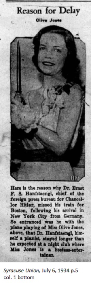 July 6, 1934 page 5 Here is the reason why Dr. Ernst F.S. Hanfstaengl, Chief of the Foreign Press Bureau for Chancellor Hitler, missed his train for Boston, following his arrival in New York City from Germany. So entranced was he with the piano playing of Miss Olive Jones, above, that Dr. Hanfstaengl, himself a pianist, stayed longer then he expected at a night club where Miss Jones is a hostess-entertainer. |