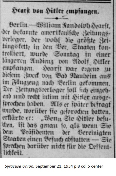 September 21, 1934 page 8 _____ Berlin. — William Randolph Hearst, the well-known American newspaper publisher who controls the arget newspaper chain in the United States. was received in a lengthy audience by Adolf Hitler. Hearst came specifically for the audience in Berlin from Bad Nauheim. Hearst is reported to have spoken at length and very intimatel with Hitler. As he was later asked about it, he stated, "When you visit Hitler, it's just the same as when you visit the President of the United States — They speak about nothing for publication." |