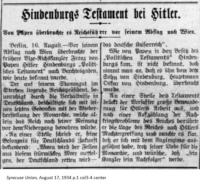 August 17, 1934 page 1 _____ Von Papen delivered it to the Reichsführer (National Leader) before his Departure for Vienna. _____ Berlin, August 16th. — As reported today, before his departure for Vienna former Vice-Chancellor Franz von Papen delivered Hindenburg's "Political Testament" to Hitler in Berchtesgaden. Lying on his deathbed at his ancestral estate and disturbed by the conditions in Germany, the Reich President busied himself with his last thoughts on the restoration of the monarchy, which in his opinion could prevent the downfall of the nation. In one section he wrote about his concerns for Germany's future: "When will the rocky pinnacle rise out of this stormy sea to rescue Germany — the German Empire." It's unknown how von Papen came into possession of the "Political Testament," yet one might assumevon Hindenburg. In a section of the testament the author expressed great admiration for Hitler's work and after listing the number of postwar problems in the nation he touched upon the nation's situation after Hitler's seizing of power and made it clear that he had reconciled himself with the Nazi Regime and despite his love for the monarchy it was his wish that "his Chancellor would become his successor." |
