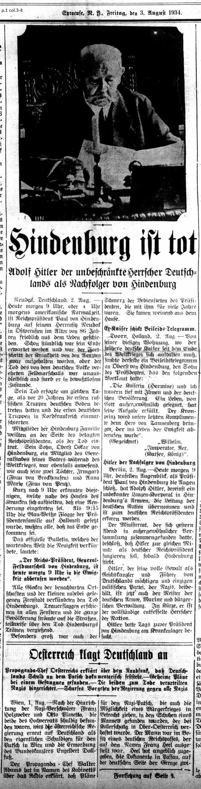 August 3, 1934 page 1 _____ Adolf Hitler the Unrestricted Ruler of Germany as Successor to von Hindenburg _____ Neudeck, Germany, August 2nd. — This morning at 9AM, or 4AM American Standard Time, Reich President Paul von Hindenburg peacefully slipped away from this life at his estate of Neudeck in East Prussia at the age of 86 years. His end had been expected for hours as physicians were unable to halt the progress of his illness. The death of the Field Marshal so revered by the German people was inevitable and he died while in an unconscious state. His death occurred on the same day as twenty years before Russian troops first came onto German soil and the first German troops marched into northern France. Members of Hindenburg's family stood by the side of the aged Reich President as he passed away. His son, Colonel Oskar von Hindenburg, a member of his father's General Staff during the World War, was present as were his two daughters, Irmgard (Mrs. von Brockhausen) and Anna Marie (Mrs. von Pentz.) Shortly after 9AM his family, which was staying near the home of the sick man, realized that his condition had changed. At 9:15AM the blue and white flag of the President's family was placed at half-mast and everyone knew that the end had come. The official bulletin, which announced the news to the world, read: "Reich President, General Field Marshal