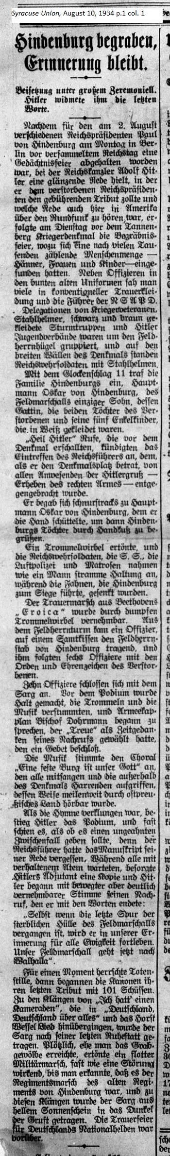 August 10, 1934 page 1 _____ Interment amid Great Ceremony — Hitler delivers the Final Words _____ Following the death of Reich President Paul von Hindenburg on August 2nd a memorial ceremony was held on Monday in Berlin before the assembled members of the German Parliament. Reich President Adolf Hitler delivered a magnificent address in which he paid tribute to the deceased Reich President. The address was heard even here in America over the radio, followed on Tuesday by a burial ceremony in front of the Tannenberg Memorial attended by many thousands of men, women and children. Next to officers in colorful, old uniforms one saw many in conventional funeral garb and the Führer of the NSAPD (National Socialist Workers Party of Germany.) Delegates of the War Veterans, Steel Helmets, black and brown clothed Stormtroopers, and Hitler Youth groups surrounded the Field Marshal's World War I observation hill (Feldherrnhügel) and at the broad walls of the Memorial Stone stood Army Soldiers with Steel Helmets. With the chiming of the bell at 11 o'clock the Hindenburg family entered. Captain Oskar von Hindenburg, the Field Marshal's only son, his wife, the two daughters of the deceased, and his five grandchildren were all dressed in white. Cries of "Heil Hitler," which sounded before the Memorial, announced the entry of the Führer, and as he took his place he saw the right arms of everyone in the crowd raised in the Hitler greeting. He rushed over to Captain Oskar von Hindenburg, whose hand he shook, and then went to Hindenburg's daughters and kissed each one's hand. The drum roll sounded and the Army soldiers, the S.S., the Air Patrol, and the Sailors stood at attention as the flag, which led Hindenburg to victory in Tannenburg, was lowered. The Funeral March from Beethoven's Eroica was audible through the muffled drum roll. An officer came out of the Field Marshal's Tower carrying a velvet cushion belonging to von Hindenburg. Behind him were six officers with the Field Marshal's medals and decorations of honor. Ten officers carried the coffin. They stopped before the podium. The drums and the music ceased. Army Chaplain Bishop Dohrmann began to speak. "Loyalty" was chosen as the central theme of his eulogy, which ended with a prayer. The choral piece, "A Mighty Fortress is Our God," was played and all sang along. Those living well beyond the Memorial were amazed by the way the song could be heard miles away throughout the East Prussian countryside. As the hymn faded away, Hitler climbed the podium, and it quickly seemed as through there had been an unforeseen incident, because the Reich Führer had forgotten his manuscript. While all waited with baited breath, Hitler's adjutant gave Hitler a copy of the eulogy and Hitler began with a moving but significantly perceivable tone in his voice with which he ended: "Even when the last trace of the mortal remains of the Field Marshal are gone, he will live on in our memories for eternity. Our Field Marshal is now going to Valhalla." For a moment there was dead silence, then the cannons began their tribute with 101 shots. To the tune of "I had a comrade" and going on to "Deutschland, Deutschland über alles" and the Horst Wessel Song the coffin was carried to its final resting place. Suddenly, before they reached the burial vault, an upbeat military march played, almost working like an annoying noise until people recognized that it was the regimental march of Hindenburg's old regiment and to this tume the coffin was carried from the bright sunshine to the dark of the crypt. The funeral for Germany's national hero was over. |
