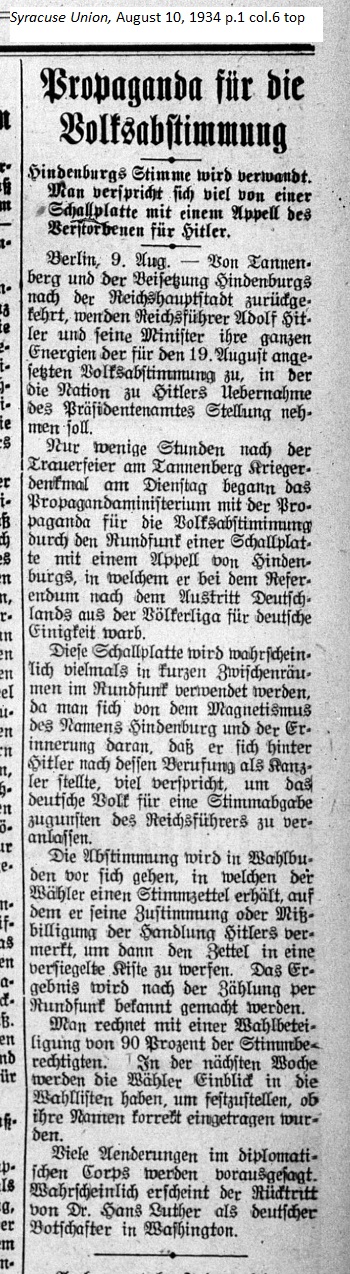 August 10, 1934 page 1 _____ Hindenburg's Voice will be used — Much talk about a Recording with a Plea from the Dead Man for Hitler _____ Berlin, August 9th. — Having returned to the capital city from Tannenberg and Hindenburg's funeral, Reich Führer Adolf Hitler and his ministers are applying all their energy to the August 19th referendum in which the nation is expected to accept Hitler's takeover of the Presidential Office. Only a few hours after the funeral ceremony at the Tannenberg War Memorial on Thursday, the Propganda Ministry began with the propaganda for the referendum with a radio broadcast of a record with a plea in which Hindenburg made an appeal for German unity during the referendum after Germany's exit from the League of Nations. This recording was probably broadcast many times in the interim since people felt the magnetism of the name Hindenburg and the memory of how he had backed Hitler after his appointment as Chancellor and thus would prompt a favorable vote by the German people approving Hitler as Reich Führer. Voters will go into an election booth containing a slip of paper on which they will mark their approval or disapproval of Hitler's policies. The paper will then be placed into a sealed box. Results will be made known by radio after the counting of the ballots. There's expected to be 90 percent participation by eligible voters. In the next week voters will have a chance to look at the voting roster to see if their names are correctly listed. Many changes in the diplomatic corps are predicted. It seems likely Dr. Hans Luther will be recalled as German Ambassador to Washington. |