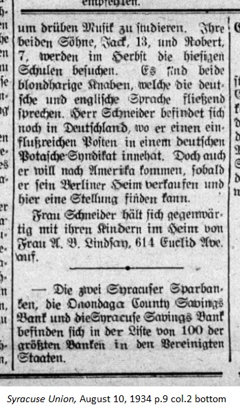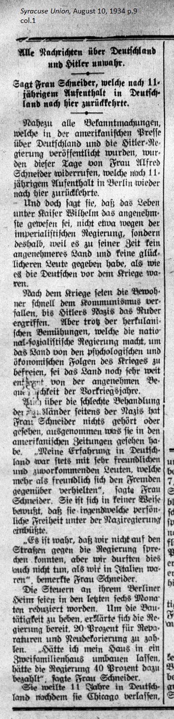 August 10, 1934 page 9 _____ Says Mrs. Schneider, who returned here from Germany after an Eleven Year Stay _____ Almost all the information, which was published in the American Press concerning Germany and the Hitler government, was disputed recently by Mrs. Alfred Schneider, who returned here after an eleven year stay in Berlin. And though she still says that life under Kaiser Wilhelm was the most pleasant, not because of the Imperial government but rather because during its time there was no more happy country and there were no more fortunate people as Germans before the war. After the war the residents quickly turned to Communism until Hitler's Nazis seized the helm. However despite Herculean efforts made by the National Socialist government to liberate the country from the psychological and economic consequences of the war, the country was far from the comfort of the prewar years. Additionally Mrs. Schneider has not heard nor seen anything of the bad treatment of foreigners by the Nazis except for what she saw in the American press. "My experiences in Germany were with friendly and courteous people who were more than kind to foreigners," Mrs. Schneider said. She was in no way aware of restrictions in her personal freedom under the Nazi government. It is true that we may not speak against the government on the streets but we also wouldn't do that if we were in Italy either," Mrs. Schneider remarked. The taxes on her Berlin home have been reduced in the last six months. The government has declared itself ready to increase construction activities by paying 20 percent for repairs and remodeling. "If I had turned my home into a two-family house the government would pay 40 percent," Mrs. Schneider said. She stayed in Germany eleven years after leaving Chicago to study music. Her two sons, Jack 13 and Robert 7, will be attending the schools here in the fall. Both are blond-haired boys, who speak German and English fluently. Mr. Schneider is still in Germany where he has an influential position in a German Potash Syndicate. He also wants to come to America as soon as his Berlin home is sold and he can find a position here. Mrs. Schneider is currently living with her children in the home of Mrs. A.B. Lindsay, 614 Euclid Ave. — The two Syracuse Savings Banks, the Onondaga County Savings Bank and the Syracuse Savings Bank, are on the list of the 100 largest banks in the United States. |