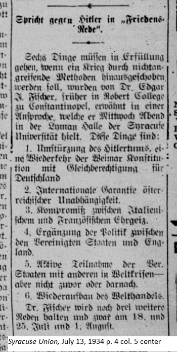 July 13, 1934 page 4 _____ Dr. Edgar J. Fischer, formerly of Robert College of Constantinople, listed six things which must come to fruition if a war is to be delayed by non-agressive methods in a lecture he gave Wednesday evening in the Lyman Hall of Syracuse University. Those things are: