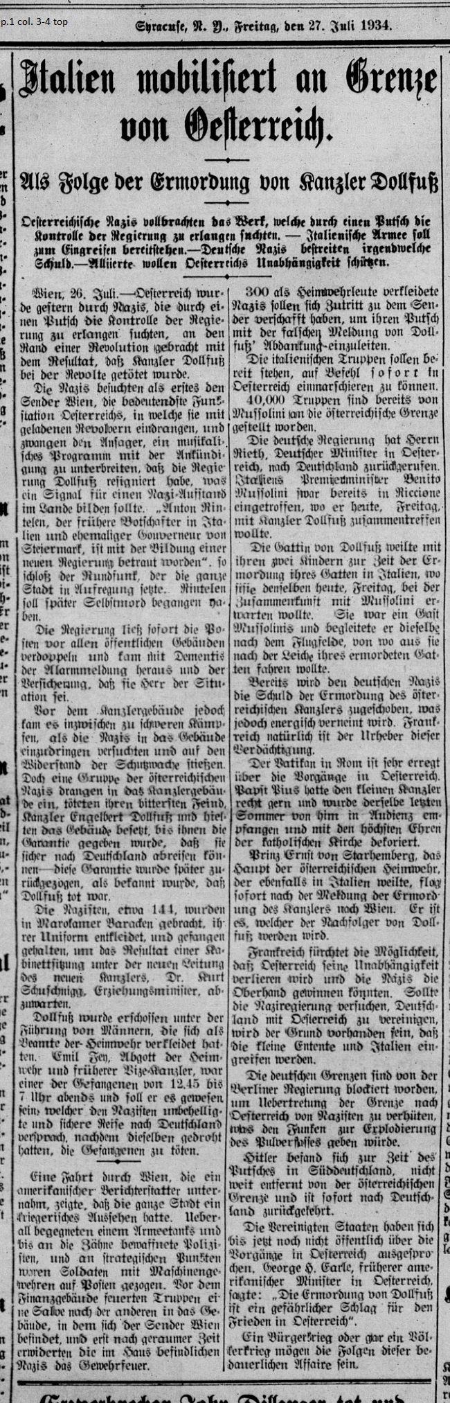 July 27, 1934 page 1 _____ Following the Murder of Chancellor Dollfuss _____ Austrian Nazis performed the Work, which attempted to gain Control of the Government through a Coup — Italian Army stands ready to respond — German Nazis deny any Involvement — Allies will protect Austria's Independence _____ Vienna, July 26th. — Austria was brought to the verge of revolution yesterday by Nazis who attempted to gain control of the government though a coup with the result that Chancellor Dollfuss was killed in the revolt. At first the Nazis attempted to seize Radio Vienna, the most important station in Austria, using loaded revolvers and forcing the announcer to interrupt a musical program with the announcement that the Dollfuss government had resigned. This was supposed to signal a Nazi uprising throughout the country. "Anton Rintelen, former ambassador to Italy and current governor of Steiermark, has been entrusted with the building of a new government." This closed the broadcasr, which set the entire city into commotion. Later Rintelen allegedly committed suicide. The government immediately doubled all patrols in from of public buildings and issued an announcement denying the broadcast and assurances that it was mastering the situation. In the interim there was heavy fighting in front of the Chancellor's building as the Nazis tried to infiltrate it and resistance by the guards escalated. One group of Austrian Nazis pushed into the building, killed its bitterest enemy, Chancellor Engelbert Dollfuss, then occupied the building until they were given the guarantee that they could safely travel to Germany — this guarantee was later rescinded when it became known that Dollfuss was dead. The Nazis, around 144 of them, were taken to Marokam Barracks, divested of their uniforms and held in confinement pending the result of a Cabinet meeting under the leadership of the new Chancellor, Dr. Kurt Schuschnigg, the Education Minister. Dollfuss was shot while in custody of men disguised as officers of the Home Guard. Emil Fey, idol of the Home Guard and former Vice-Chancellor, was one of the captives from 12:45 to 7 o'clock in the evening and supposedly it was he who deceived the Nazis and promised them safe passage to Germany after they had threatened to kill the captives. A drive through Vienna, which one American reporter undertook, indicated that the entire city had a warlike appearance. One encountered army tanks and policemen armed to the teeth and there were soldiers posted at strategic points with machine guns. Troops fired one salvo after another inside the the Finance Building, in which the Vienna Radio Station was located and after a while the Nazis located inside responded with rifle fire. 300 Nazis disguised as Home Guard reportedly gained entry to the radio station to start the coup with a false announcement of Dollfuss' resignation. Italian troops allegedly stood ready waiting for orders to march immediately into Austria. Mussolini had already placed 40,000 troops at the Austrian border. The German government recalled Mr. Rieth, German Minister in Austria, back to Germany. Italy's Premier Benito Mussolini was already in Riccione where today, Friday, he wanted to meet with Chancellor Dollfuss. When her husband was being killed, Dollfuss' wife and their two children were spending time in Italy, where on Friday they were expected to meet with Mussolini. She was Mussolini's guest and he accompanied her to the airfield from which she would depart and then drive to the corpse of her murdered husband. German Nazis were blamed for the death of the Austrian Chancellor, a charge which they vehemently denied. Naturally France is the originator of the allegation. The Vatican in Rome is very upset by the events in Austria. Pope Pius liked the little Chancellor and held an audience with him last summer and decorated him with the highest honor of the Catholic Church. Prince Ernst von Starhemberg, head of the Austrian Home Guard who was also in Italy, flew back to Vienna immediately after the announcement of the Chancellor's murder. It is he who will become Dollfuss' successor. France fears the possibility that Austria will lose its independence and the Nazis could win the upperhand. Should the Nazi regime attempt to unite Germany with Austria there will be reason to believe that the Little Entent and Italy will join forces with them. The German borders have been blockaded by the Berlin government to prevent Nazis from crossing the border into Austria, which could light the fire that explodes the tinderbox. At the time of the coup Hitler was in Southern Germany, not far from the Austrian border. He immediately returned to Germany. The United States has not publically issued any statement on the events in Austria. George H. Carle, former American Minister in Austria said, "The murder of Dollfuss is a dangerous blow to peace in Austria." A civil war or an international war may result from this regrettable affair. |