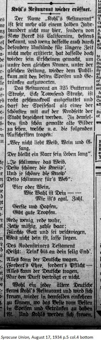 August 17, 1934 page 5 _____ The name "Kohl's Restaurant" hasn't been around here for more than half a century but it's been well known from New York to California, and even if it hasn't existed due to certain conditions for a long time, it has made a reappearance under the same name and under the same management, serving the public the best food and drink. The restaurant at 325 Butternut St, corner of Townsend St., is tastefully decorated and the dining hall on the northside of the city may be defined as one of the most beautiful. Within there are beautifully painted old pictures, some of which contain the following inscriptions: