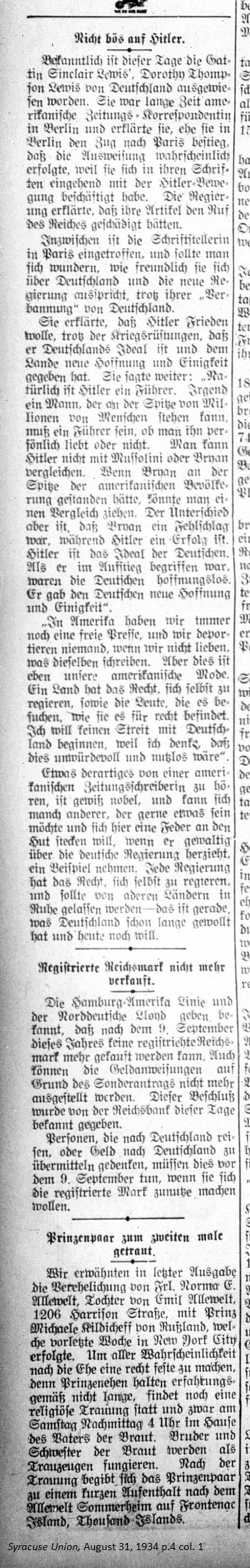 August 31, 1934 page 4 _____ The other day the wife of Sinclair Lewis, Dorothy Thompson Lewis, was expelled from Germany. She was a longtime American newspaper correspondent in Berlin and before she boarded the train in Berlin for Paris she said that the expulsion was probably the result of her writing about the Hitler Movement. The government declared that her articles might have damaged the Reich's reputation. Since then the author has reached Paris, one might wonder just how kindly she speaks about Germany and the new government in spite of her banishment. She stated that Hitler might want peace despite the war rearmament, that he is Germany's ideal man and he has given new hope and unity to Germany. She said further, "Hitler is a natural leader. Any man, who can stand at the top of millions of other men, must be a leader whether or not he is loved personally. One cannot compare Hitler with Mussolini or Bryan. If Bryan had stood at the pinnacle of the American people, one might have been able to make a comparison. However the difference is that Bryan was a failure while Hitler is a success. Hitler is the ideal of the German people. When he was realizing his ascent, the Germans were without hope. He gave the Germans new hope and unity." "In America we always have a free Press and we deport no one if we don't love what they wrote. However this is not our American model. A country has the right to govern itself even if the people, who visit it, do not consider it right. I don't want to start a dispute with Germany because I think it would be worthless and useless." It's truly noble to hear something like that from an American newspaper reporter and let anyone else say what he wants and stick a feather in his hat, if he's powerful enough to disparage the German government, let him follow this example. Each government has the right to govern itself and other countries should leave it in peace. That's just what Germany has wanted all along and it wants it today. Registered Reich Marks No Longer Sold _____ The Hamburg America Line and North German Lloyd have announced that after September 9th of this year registered Reich Marks can no longer be purchased. Money transfers can also no longer be issued due to this special ruling, a decision announced by the Reichsbank. Persons travelling to Germany or transferring money to Germany must do this before September 9th if they want to make use of the registered Mark. Royal Couple Marry for the Second Time _____ In the last issue we mentioned the marriage of Miss Norma E. Allewelt, daughter of Emil Allewelt of 1206 Harrison St. with Prince Michaele Kildicheff of Russia, which occurred last week in New York City. To firmly anticipate all probabilities surrounding the marriage since experience indicates royal marriages do not hold together for very long, a religious ceremony took place Saturday afternoon at 4 PM at the home of the father of the bride. The brother and sister of the bride acted as witnesses. After the ceremony the royal couple went for a short stay at the Allewelt summer home on Frontenac Island, Thousand Islands. |