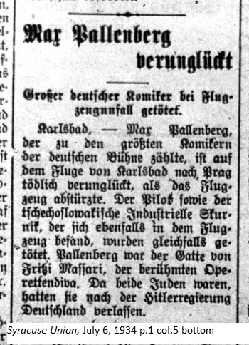 July 6, 1934 page 1 _____ Great German Comedian Killed in an Airplane Crash Karlsbad. — Max Pallenberg, who is counted among the greatest comedians of the German Theater, was in an accident and killed when the plane travelling from Karlsbad to Prague crashed. The pilot and the Czech industrialist Skurnik were also killed. Pallenberg was the husband of Fritzi Massari, the famous operetta diva. They were both Jewish and had left Germany after the Hitler government came into power. |