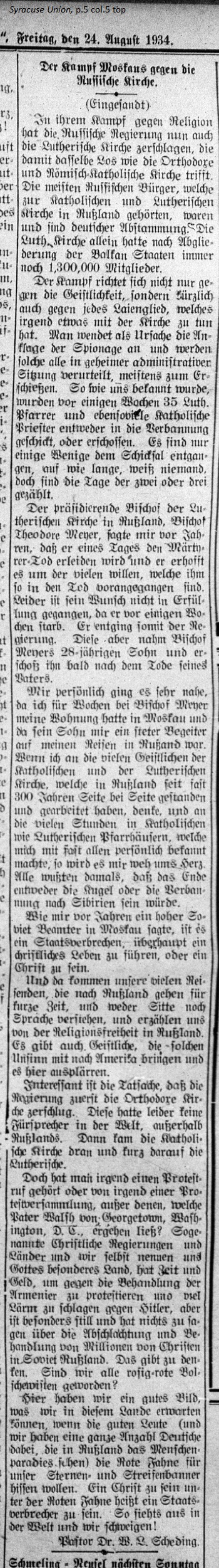 August 24, 1934 page 5 _____ (Sent in) In its battle against religion, the Russian government has now shattered the Lutheran Church and left it to the same fate as that encountered by the Orthodox and Roman Catholic churches. Most Russian citizens. who belonged to the Catholic and Lutheran churches in Russia, were and are of German descent. The Lutheran Church alone had 1,300,000 member after its incorporation with the Balkan States. The fight is not only aimed at the clerics but also recently against lay members, who have anything to do with the churches. They issue charges of espionage and pass judgment on them in secret administrative sessions, mostly death by firing squad. We know that 35 Lutheran pastors and as many Cahtolic priests were either sent into exile or shot. There are only a few who escaped that fate but for how long? No one knows, two to three days? The presiding bishop of the Lutheran Church in Russia, Bishop Theodore Meyer, told me years ago that he would suffer a martyr's death someday and he expected it would be for the sake of the many who preceded him. Unfortunately his wish was not fulfilled since he died a few weeks ago. He escaped the government, however it took Bishop Meyer's 28-year-old son and shot him soon after his father's death. This hit me pretty hard because I had stayed for weeks at Bishop Meyer's home in Moscow and his son was a constant companion on my trip in Russia. When I remember all the clerics of the Catholic and Lutheran churches who stood alongside and worked in Russia for almost 300 years, I think of the many hours I spent in Catholic and Lutheran pastors' homes and how I got to know just about all of them personally. It makes my heart ache. They all knew back them that the end would come either with a bullet or exile in Siberia. As a high-ranking Soviet official told me years ago in Moscow, it is a crime against the State to live a Christian life or to be a Christian. And then there are our many travelers who spend a short time in Russia and understand neither its customs nor its language and tell us about the religious freedom in Russia. There are also clerics who bring such nonsense to America and spout it here. It's an interesting fact that the government first smashed the Orthodox Church. Unfortunately it had no advocates in the world outside of Russia. Then it was onto the Catholic Church and recently onto the Lutherans. Has anyone heard a word of protest or of any protest group except for those indulged by Father Walsh of Georgetown, Washington, D.C? So-called Christian governments and countries and we ourselves, who call our nation God's special country, have time and money to protest against the treatment of the Armenians and raise the alarm against Hitler, but remain still with nothing to say about the slaughter and maltreatment of millions of Christians in Soviet Russia. That's something to think about. Are we all becoming rosy-red Bolshevists? We here have a good idea of what we can expect in this country if good people want to raise the Red Flag in place of the Stars and Stripes (and we have a large number of Germans here who see a humane paradise in Russia.) To be a Christian under the Red Flag means to be a criminal of the State. It looks that way and we remain silent! Pastor Dr. W.L. Scheding [Translator's Note: This is the first time I've seen the Pastor use "Dr." before his name. Doctorate granted earlier in 1934?] |