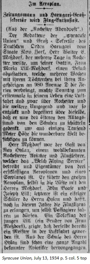 July 13, 1934 page 5 _____ Newspaperman and Grand Secretary of the Harugari becomes a Flight Enthusiast _____ From the Rochester Abendpost The editor of the Syrcuse Union and Grand Secretary of the German Order of the Harugari of the State of New York, Walter E. Mossdorf, spent many days in Rochester so his wife, Mrs. Maria Lill-Mossdorf along with their little daughter could spend their vacation with her relatives at 980 Avenue D. For the first time in his life on Sunday he took an airplane ride over Rochester and the surrounding area and he was so delighted and enthused by it that he's now considering shaking the everyday dust off his shoes and seeing the marvelous world from a few thousand meters higher. Mr. Mossdorf was the guest of Ray Hylan, a well-know Rochester aviator and flight instructor, who operates the "Welch Flying Service" and is the owner of three first-class airplanes and one seaplane. He hinself flew the large airplane into the air with Messrs. Mossdorf, John Boase, and Joseph Lill, the later an avid student of Mr. Hyland who hopes to get his flight license later this year so he may transport passengers. A solo flight of young Lill (a brother of Mrs. Mossdorf) indicates that he has already become an aviation master. A large number of well-known aviators have already come out of Mr. Hylan's school. |