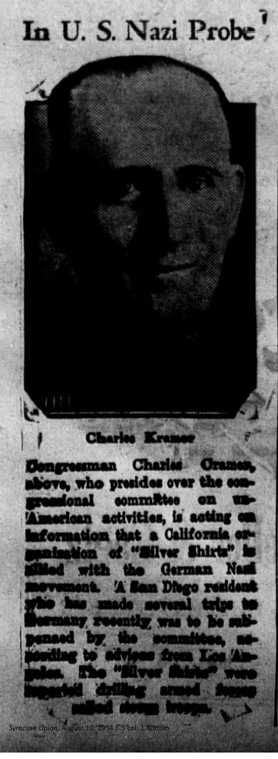 August 10, 1934 page 3 [Magnified to make the text legible] Congressman Charles Kramer, above, who presides over the congressional committee on unAmerican activities, is acting on information that a California organization of "Silver Shirts" is allied with the German Nazi movement. A San Diego resident who has made several trips to Germany recently was to be subpoenaed by the committee, [last four lines unclear] |