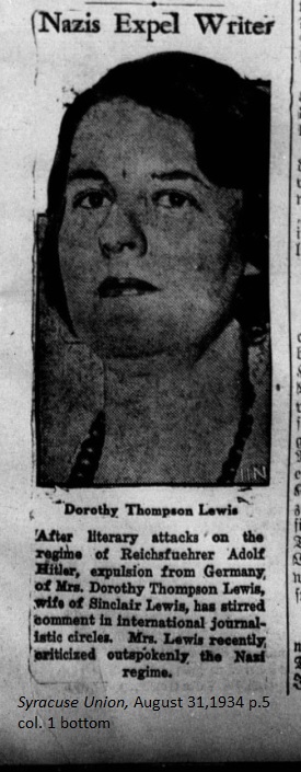 August 31, 1934 page 5 Dorothy Thompson Lewis After literary attacks on the regime of Reichsfuehrer Adolf Hitler, expulsion from Germany of Mrs. Dorothy Thompson Lewis, wife of Sinclair Lewis, has stirred comment in international journalistic circles. Mrs. Lewis recently criticized outspokenly the Nazi regime. |