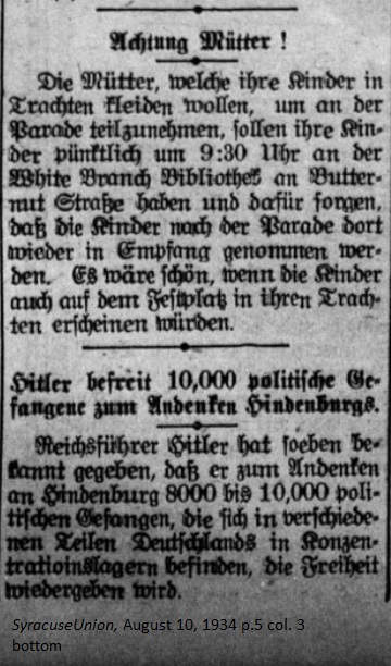 August 10, 1934 page 5 _____ Mothers, who want to dress their children in costumes so they can take part in the [German Day] parade, should bring their children promptly at 9:30 to the White Branch Library on Butternut St. and make sure that the children will be met back there after the parade. It would be nice if children also appeared on the festival grounds in costume. Hitler Frees 10,000 Political Prisoners in Memory of Hindenburg _____ Reich Führer Hitler has just announced that in Hindenburg's memory he will return the freedom of 8,000 to 10,000 political prisoners who are in various concentration camps in Germany. |